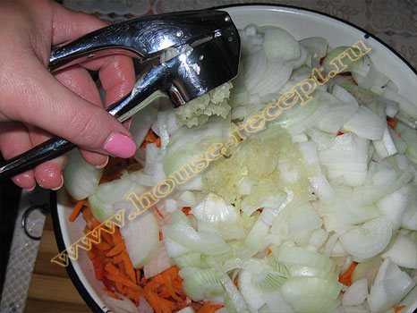 Делаем своего рода салат из нарезанных овощей. Туда измельчаем чеснок.