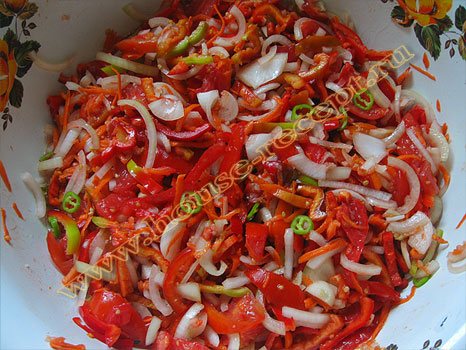 - Далее надо взять большую посудину для варки овощного салата. В нее выкладываются все овощные заготовки. Масса приправляется сахаром и сдабривается солью. В овощную смесь вливается необходимое количество растительного масла. Продукты перемешиваются и отправляются на огонь. Состав потребуется довести до кипения.