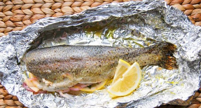 - Вынутую из фольги рыбу украсить кусочками лимона.