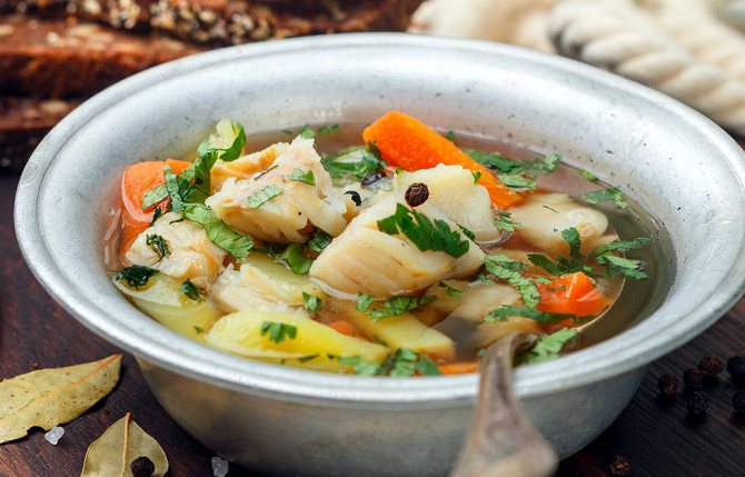 Затем добавьте подготовленные овощи к рыбе и проварите все вместе 20 минут. На последнем этапе необходимо насыпать соль, добавить лавровый лист, душистый перец горошком и снова варить около 5 минут.