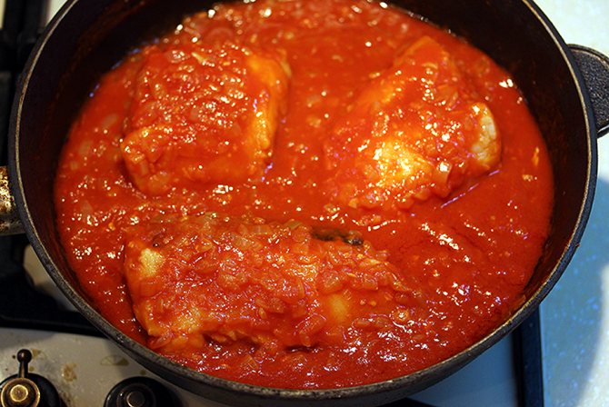 - Залить смесью рыбу и, закрыв сковороду крышкой, тушить четверть часа на небольшом огне.
