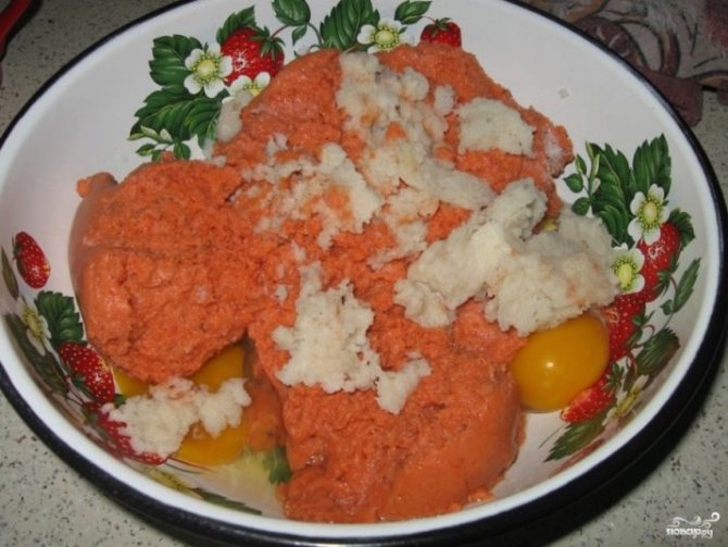 - Лук нашинковать кубиками, морковь пропустить через мясорубку с крупными ячейками, рыбу разделать, удалив кости, внутренности и чешую, измельчить филе на мясорубке, чесночные дольки меленько порезать. Всё соединить в одной чаше.