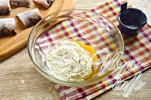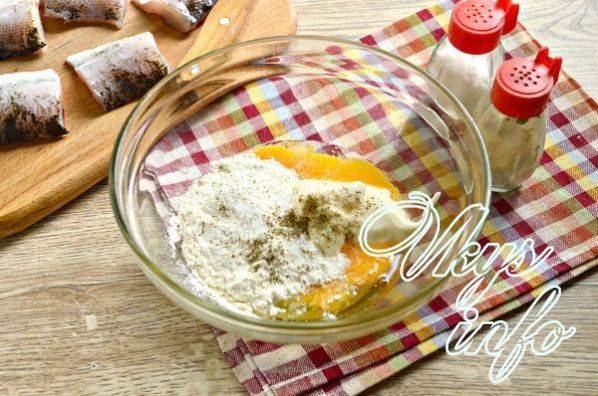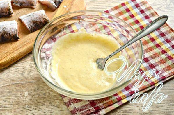 Пока рыба пропитывается солью, приготовьте кляр. Берете яйца, тщательно взбиваете их, добавляете ложку молока, примерно две ложки муки маленькими порциями. Продолжаете взбивать до получения однородной массы.