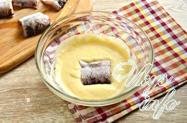 - Рыбные кусочки поместить в тесто так, чтоб они полностью были покрыты.