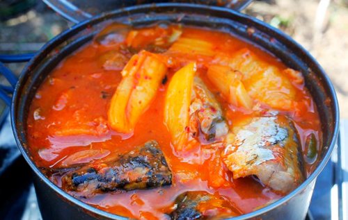 - Добавьте томатную пасту, размешайте. Подлейте бульон, выложите кусочки скумбрии. После закипания томите под крышкой не менее 20 минут.