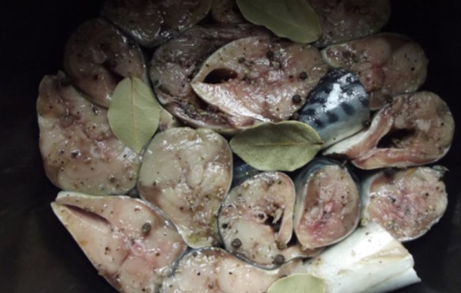 Из пряностей попробуем использовать в самом минимальном количестве перец черный душистый горошек и черный горошек. Консервы готовятся долго, если положить в скумбрию большое количество пряностей, они испортят натуральный вкус и запах рыбы.