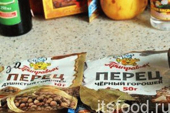 - Специи: лавр, черный перец горошком, белый перец горошком, гвоздика — по вкусу;