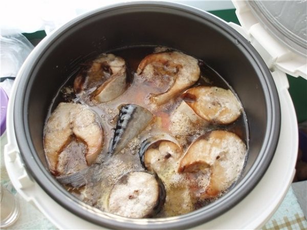 - В чашу мультиварки влейте масло, положите в емкость куски скумбрии.