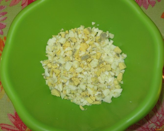 Куриные яйца нужно отварить вкрутую, немного подержать в холодной воде, очистить от скорлупы. Вареный картофель очищаем от мундира и нарезаем кубиками, яйца тоже рубим кубиками.