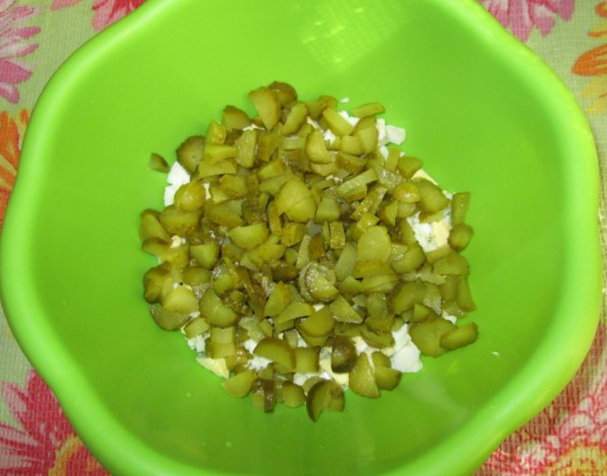 Приготовление аналогично салату Оливье: все отварные овощи нарезаем кубиками. Маринованные огурчики также режем кубиками. Зеленые оливки режем кружочками. Заправляем салат сметаной обезжиренной либо майонезом. Солим салат и тщательно перемешиваем.