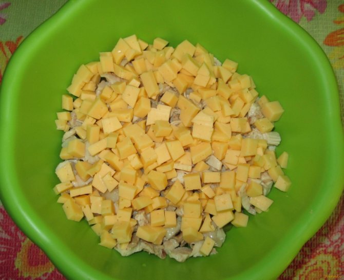 - Пикантный салат с курицей, оливками, сыром и свежими помидорами