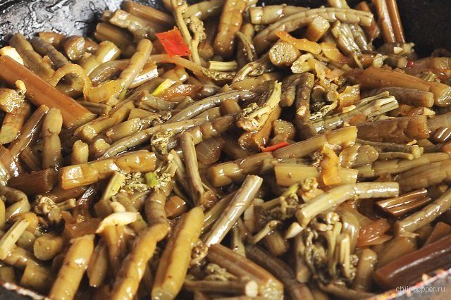 В небольшом количестве масла обжарить мелко порезанный лук, чтобы он приобрёл золотистый оттенок. Предварительно подготовленные побеги папоротника нарезать на кусочки и отправить к луку. Сразу же в сковороду следует добавить соевый соус, раздавленный прессом чеснок, приправу и перец чили. Содержимое как следует перемешать и тушить с закрытой крышкой пару-тройку минут.