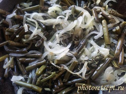 Папоротник подготовить вышеуказанным способом, обдать холодной водой и порезать небольшими кусочками (не более 5 см). Лук порезать полукольцами и слегка обжарить на постном масле. Затем добавить ростки папоротника и подержать на огне ещё минут 10-15 до готовности.