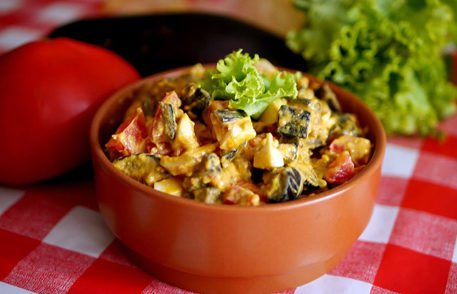 Вкусный и сытный салат с жареными баклажанами и яйцами вполне заменит ужин.