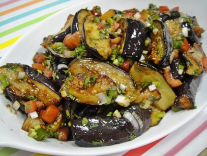 Теплый или горячий салат из баклажанов – отличный обед или ужин. Это сытное, но довольно легкое блюдо с пикантным вкусом, безусловно, относится к здоровой пище.