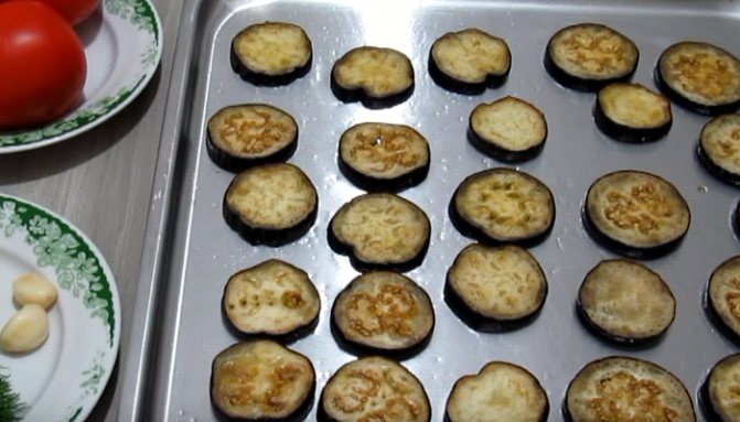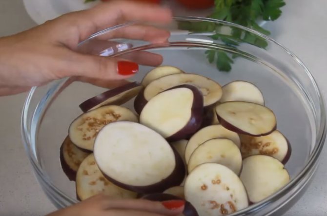 - Очищать баклажаны предварительно не надо. Нарезать кружочками таким образом, чтобы толщина не превышала 5 мм. Подсолить и оставить на полчаса.
