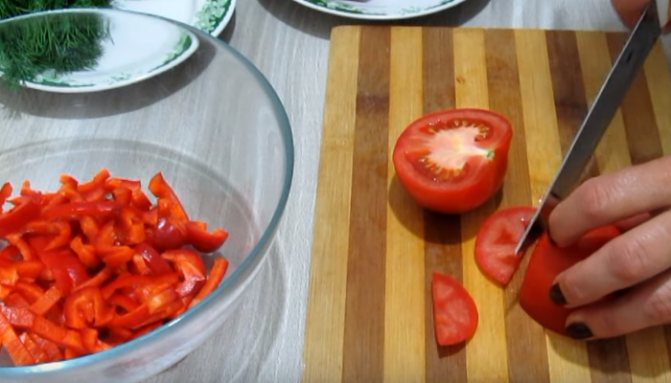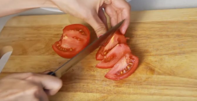 Одну помидорку режем по вкусу. Мы любим узкие дольки. Эту красоту используем для топинга. Остальные томаты — в заправку.