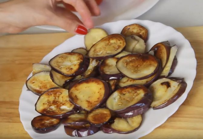 - Кружочки баклажана поджарить с каждой стороны и отправить в салат.