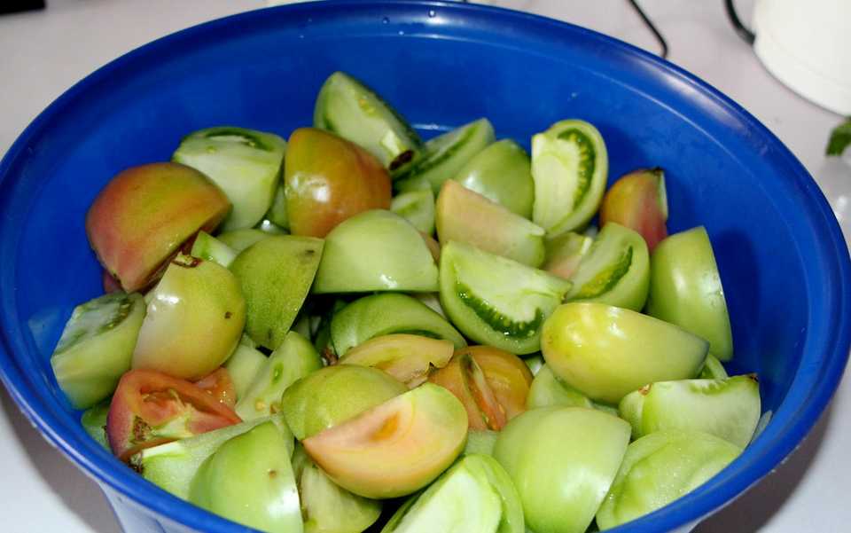 - Помидоры прокручиваем через мясорубку. Выкладываем томат в таз, добавляем соль, масло, соль и перемешиваем. Ставим емкость на плиту, чтобы масса уварилась.