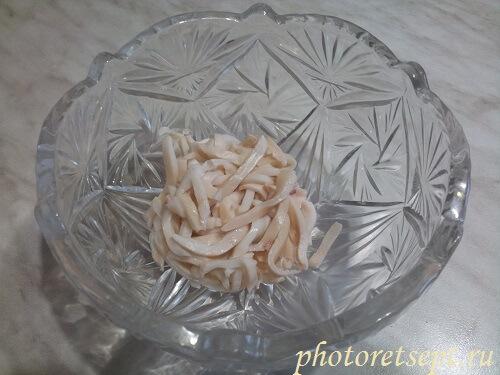 1. Откройте баночку с кальмарами и слейте рассол. Если кольца кальмаров длинные, нарежьте их. Выложите в тарелку.