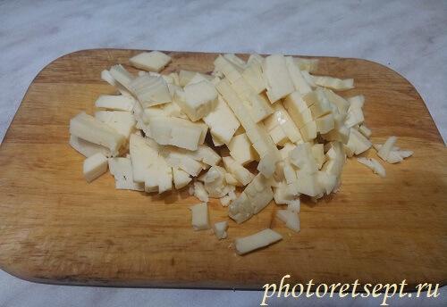 6. Яйца отварить, очистить и нарезать кубиками. Смешать сыр с яйцами и чесночным майонезом.