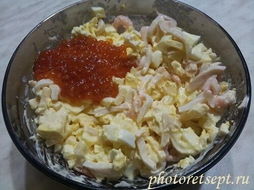 Смешать все приготовленные продукты, добавить несколько столовых ложек красной икры, майонез, осторожно перемешать. Соль может не понадобиться