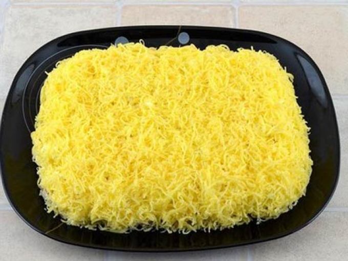- Поверх желтка трется сыр, мелко натертый. Его следует выложить на салат пышной «шапкой».