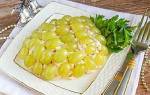- Картошка заправляется майонезом, покрывается маринованным луком.