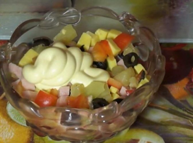 Отварная куриная грудка нарезается кубиками и укладывается ровным слоем на блюдо. Тонкой сеткой сверху наносится майонез, можно его равномерно распределить по всей поверхности. Сверху укладывается нарезанный кубиками ананас. На него — сладкий перец, нашинкованный тонкими полосками. Следующим слоем в салат с ананасом, ветчиной и сыром выкладываются вареные яйца. Их нужно нарезать кубиками. Сверху необходимо положить ветчину, подготовленную так же, как и яйца, а на нее — снова тонкий слой майонеза (сеткой). Далее укладываются нарезанные дольками огурцы, потом помидоры — кубиками. Салат промазать майонезом, сверху посыпать измельченными маслинами и тертым сыром. Затем снова нанести майонез сеткой, можно украсить зеленью.