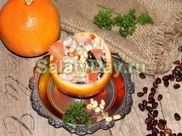 Все ингредиенты смешать и заполнить ими декоративную чашу из грейпфрута. Полить легким майонезом и украсить кедровыми орешками.