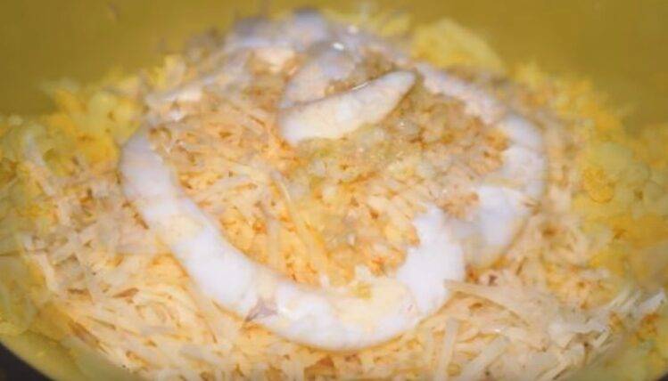 4. Последним слоем будет ароматным чесночно-сырным. Натираем сыр на мелкой терке, выдавливаем в него чеснок, добавляем майонез и перемешиваем до однородности. Майонез добавляем по чуть-чуть между перемешиваниями, чтобы случайно не налить лишнего. Сырная масса должна быть пластичной, но не жидкой.
