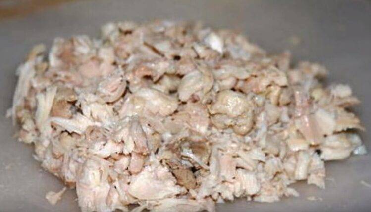 3. Копченое мясо отделяем от кости, снимаем кожу и нарезаем небольшими кусочками.
