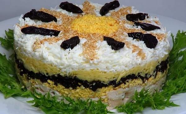 Сделать салат праздничным просто: достаточно уложить подготовленные ингредиенты слоями в кольцо. Чернослив придаст некоторой пикантности. Благодаря овощам и сухофруктам блюдо получается еще и полезным.