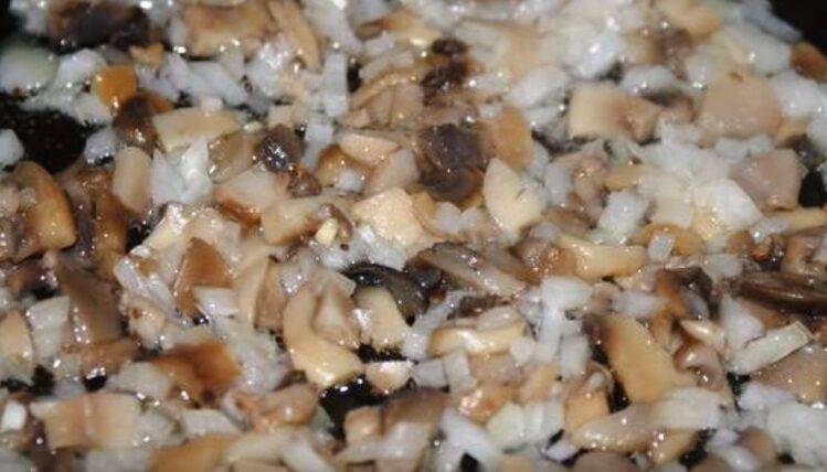 3. Третий слой это обжаренные грибы с луком. Если не умеете жарить грибы, то это выглядит так: разогреваем сковороду на среднем огне и наливаем в нее пару столовых ложек растительного масла. Кладем измельченный лук и жарим его минуты 3-4, постоянно помешивая.