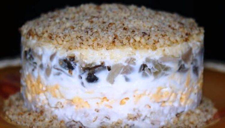 - Сложить слои в следующей последовательности: яйца, майонез, чернослив, орехи, белки, майонез, огурчики.