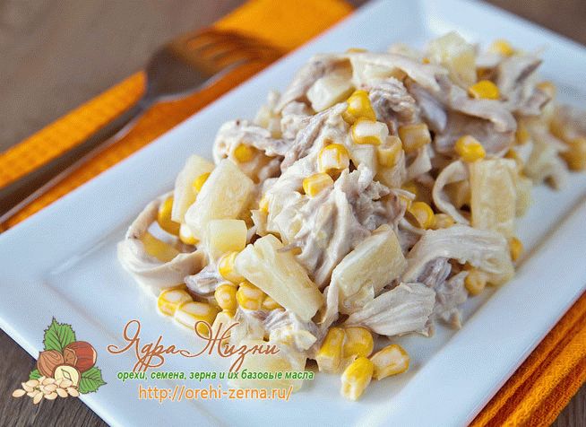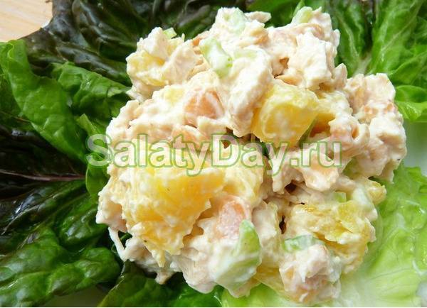 Это питательный салат, который понравится многим. Приготовление: копченая грудка нарезается квадратиками, по аналогичному принципу заготавливается твердый сыр и консервированные ананасы. Все компоненты тщательно перемешиваются между собой и заправляются майонезом. Орехи добавляются в виде украшения сверху. Салат с курицей и ананасами и грецкими орехами – это питательное и полезное блюдо, которое подойдет на любое торжество.
