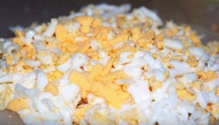 2. Яйца варим вкрутую, натираем на средней терке и выкладываем вторым слоем.