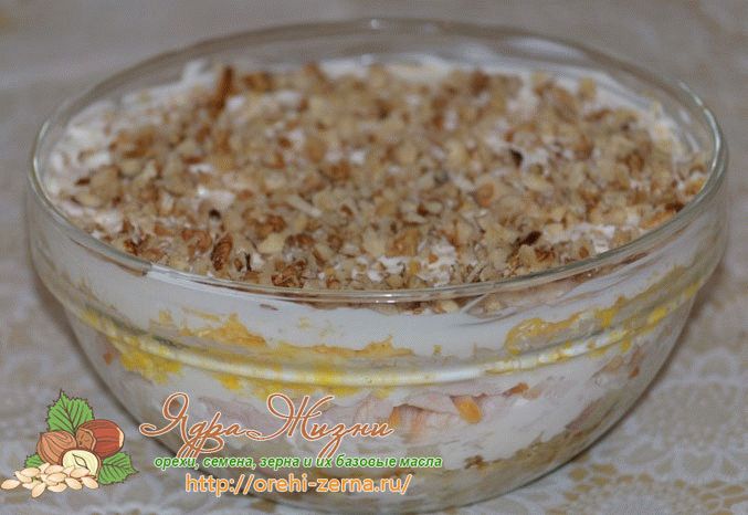 - Сверху блюдо присыпается тертыми желтками и украшается грецкими орехами по бокам.