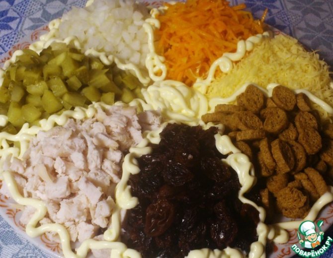 - Свежая морковь (на крупной терке), свежая белокочанная капуста (шинкуется), свежая свекла (на терке), картофель фри тонко нарезанный и обжаренный (или чипсы, которые иногда заменяются сухариками или кириешками), майонез с измельченным чесноком, отварное мясо: говядина, курица или свинина (этот вариант салата иногда встречается с вареной колбасой или вообще без мяса), консервированный зеленый горошек или кукуруза (тоже не всегда кладется)