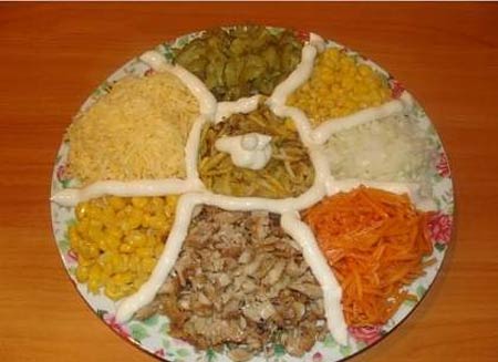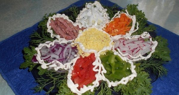 Продукты для этого салата можно брать самые разные. Подойдут любые овощи, в качестве мясного ингредиента можно брать и курицу, и колбасу, и свинину. В общем, все, что вы любите. Любители рыбы и морепродуктов могут смело использовать крабовые палочки, семгу или печень трески. В серединку цветка можно класть не только майонез, но и сметано-чесночный соус или даже густой йогурт. Для тех, кто любит не только вкусную, но и полезную пищу, рекомендуется использовать оливковое масло. Фантазии здесь есть, где разгуляться, главное – это иметь желание порадовать близких. Ниже мы предлагаем самые распространенные рецепты этого салата, впрочем, вы можете легко адаптировать под свой вкус .