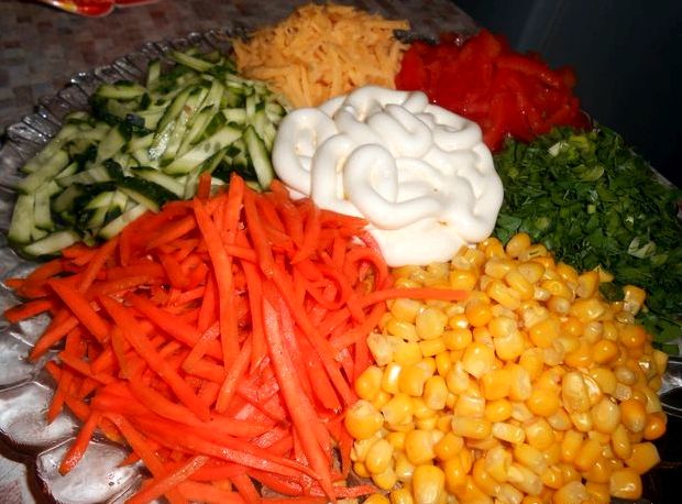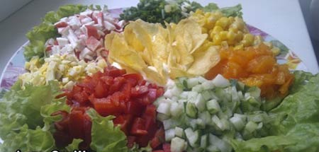 - Крабовые палочки (колбаса или мясо), сладкий болгарский перец, помидор кубиками, яйцо, кукуруза, свежий огурец, чипсы, зеленый лук, майонез