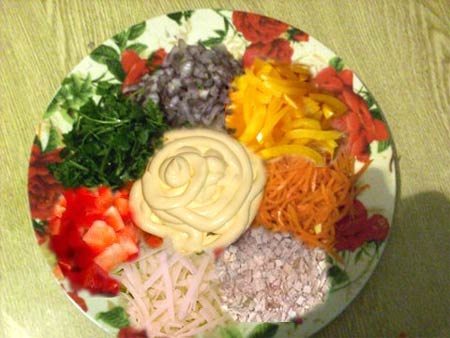 Здесь же приведу разные варианты ингредиентов (несколько рецептов) для салата семицветика или радуги: