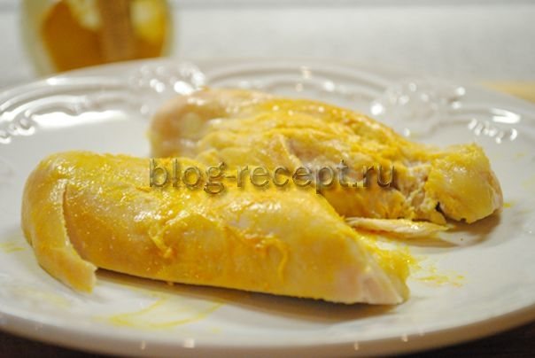 - Куриные грудки промываем под проточной водой, обсушиваем и смазываем смесью карри