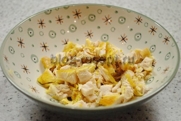- Так как варено-копченое куриное филе не нужно обрабатывать, такой вариант Тиффани готовится от силы за полчаса. Филе режут мелкими кубиками, формируют из него первый слой салата.