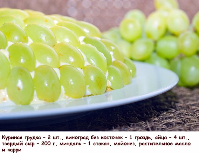 Куриную грудку натереть приправой карри. Обжарить грудку и порезать на небольшие кубики. В качестве первого слоя выложить на блюдо. Следующим этапом идет тертый сыр. Далее кладем вареные яйца, нарезанные кубиками. Завершающим слоем идем мелко рубленый миндаль. Не забывайте каждый слой промазывать майонезом. Виноград разрезать на половинки, украсить ими поверхность салата.