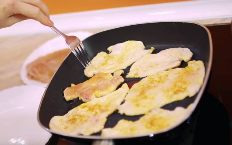 Самым важным этапом приготовления этой закуски является обжарка куриного филе. Жарить мясо нужно так, чтобы не пересушить его. Иначе вкус блюда сильно пострадает.