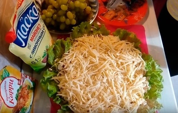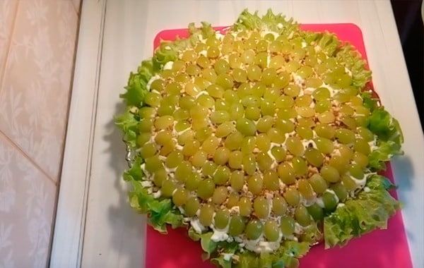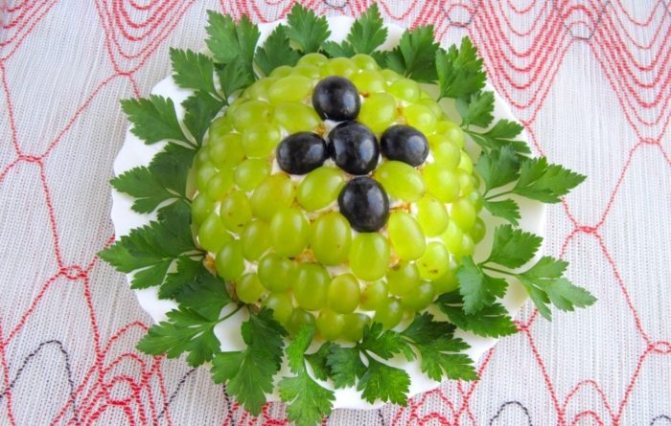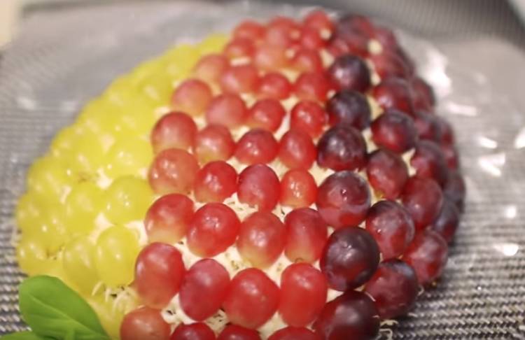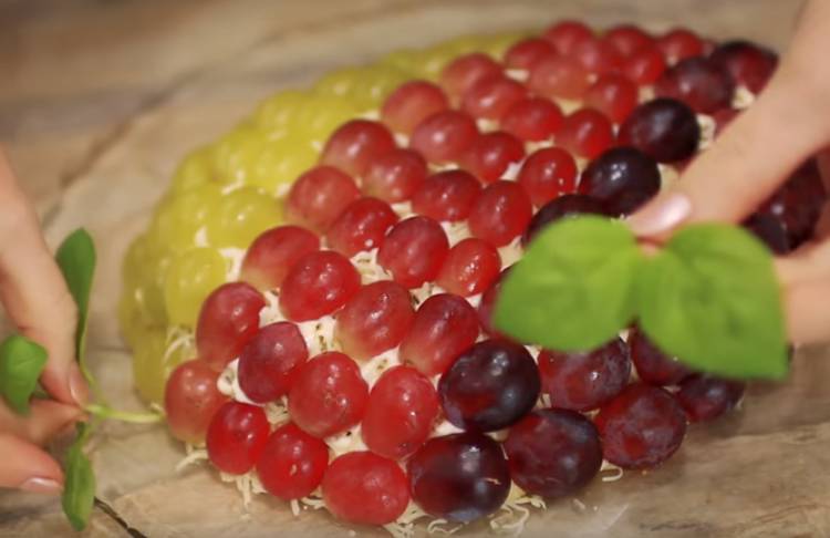 - «Инкрустируют» салат виноградинками. В данном случае, красными, без косточек.