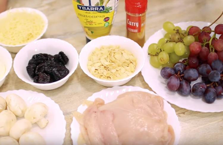 В качестве дополнительного составляющего Тиффани используют чернослив. Сухофрукты отлично сочетаются с курицей в карри, сыром и ягодами винограда. Для этого варианта салата, который называют новогодним, требуются: