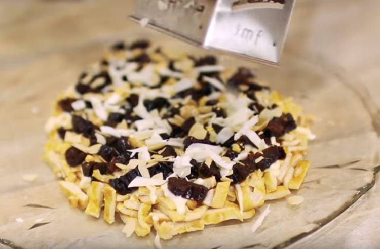 - Выложить салат на блюдо слоями (половина курицы с черносливом, половина сыра, половина яиц). Каждый слой смазать майонезом и посыпать миндальными хлопьями.