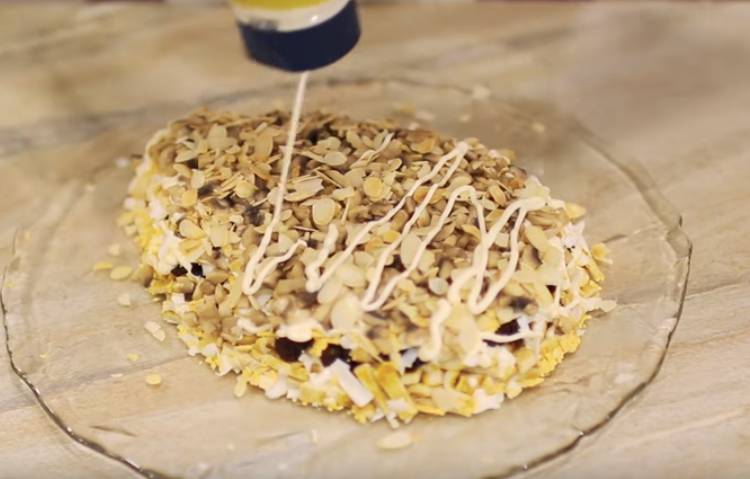 - Пропуская майонез, сверху на миндальные орешки выкладывают натертое на терку или покрошенное вилкой яйцо.